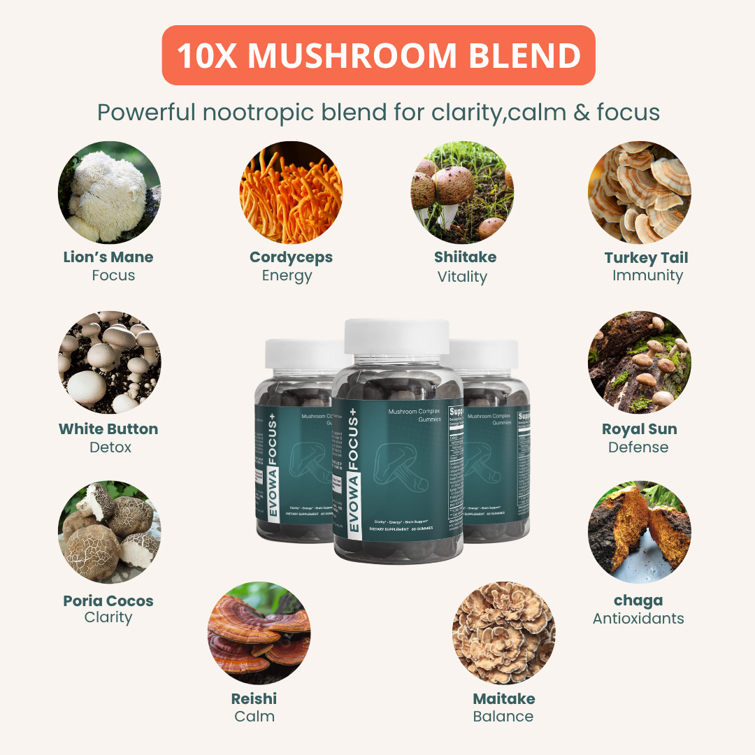 EVOWA Focus+ is your daily brain boost — powered by a 10-mushroom blend including Lion’s Mane, Reishi & Cordyceps. 🔬 Backed by nature. Designed for clarity.